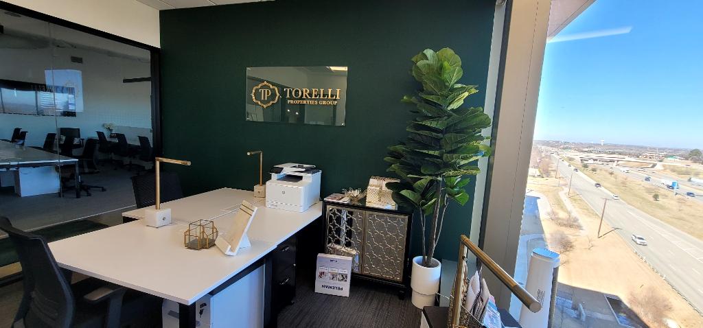 This project involved redesigning a simple white office space in a commercial building to a decadent color palate that gives the office a warm welcoming vibe. Which is perfect when it comes to a Realtor office that specializes in helping clients find their forever homes. This client wanted to create a rich environment for her employees that promoted proficient workers with creativity within their field. We used the clients color scheme from her business cards, painted the main wall green, and worked with one of our favorite sign companies to create a custom acrylic sign for their company. With added touches like gold trash cans, gold and marble desk lights, an emerald bench for extra seating, a beautiful cabinet to hide all the office supplies and a fiddle leaf fig to bring in some warmth this space was on its way to welcoming new clients. The finishing touch was a gold geometric champagne bar for celebrating all the new homes that were created that year.